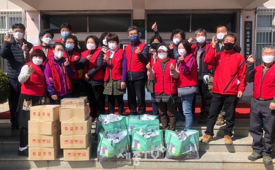 (주)미래비전(대표 조희석)에서 두유 27박스(297천원 상당), 정우김치에서 김치 44kg, 진심식품에서는 육개장을 후원했으며, 공주심마니약초(대표 정연문)에서 마스크 58세트, 유구읍 홈패션 교실(회장 김용자)에서는 면 마스크 500매를 직접 제작 후원하는 등 후원 릴레이가 이어졌다.
