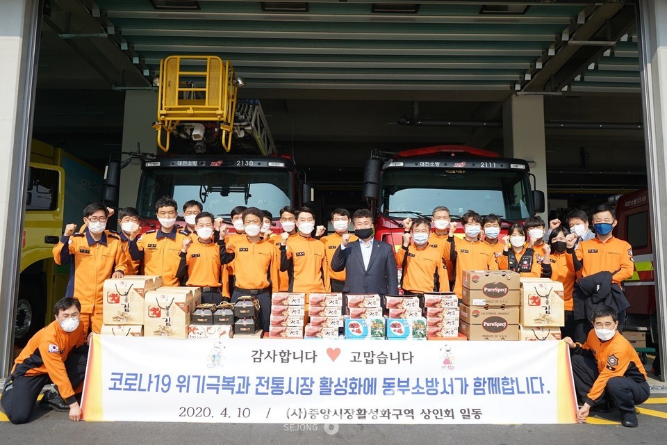대전동부소방서는 10일 코로나19로 어려움을 겪고 있는 전통시장 상인들에게 도움을 주기 위해 중앙시장에서 물품 공동구매 행사를 가졌다.