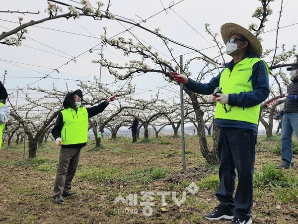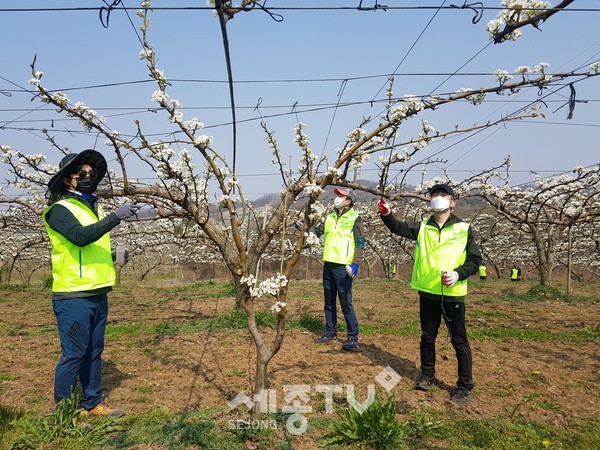 이에 충남농협 길정섭 본부장과 류병관 농협노조 충남세종지역위원장 은 배 과수농가의 부족 일손을 집중 지원하기 위해 임직원 100여명과 함께 천안시 직산농협(조합장 민병억)과 성환농협(조합장 차상락) 관내 20여 과수농가에서 배 꽃 인공수분을 도왔으며, 작업 중 마스크 착용, 2m 건강거리 유지 등 정부의 사회적 거리두기 지침을 철저히 준수하며 영농지원에 나섰다.