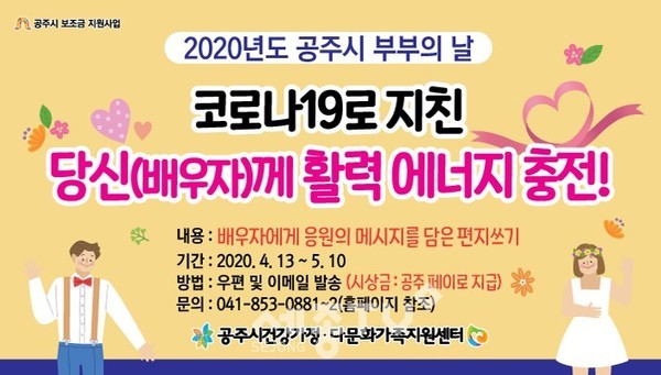공주시 건강가정다문화가족지원센터(센터장 박상옥)가 5월 21일 ‘부부의 날’을 앞두고 코로나19로 힘들고 지친 배우자에게 응원의 메시지를 전달하는 이벤트를 진행한다.