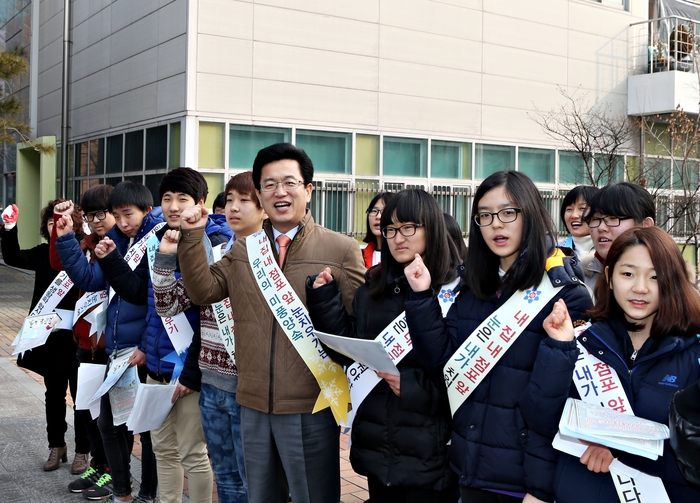대전 유성구는 17일 유성관광특구내 봉명동 상가 및 주택 밀집지역에서 허태정 유성구청장과 지역주민, 유성중학교 학생 등 50여 명이 참석한 가운데 ‘내집 내점포 앞 눈치우기 캠페인’을 벌였다.