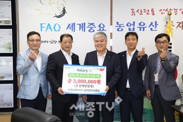 국제3680지구 금산로타리클럽(회장 박성영)은 지난 6일 금산군청을 방문해 코로나19로 어려움을 겪고 있는 군민들을 위해 써달라며 성금 300만 원을 기탁했다.