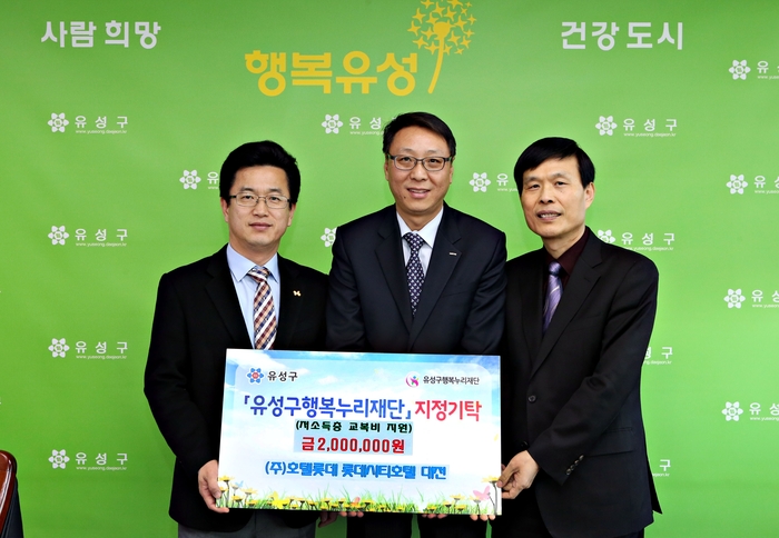 유성구(구청장 허태정)는 28일 구청 행복사랑방에서 (주)호텔롯데 롯데시티호텔대전(총지배인 박용흠)으로부터 유성구행복누리재단 사업에 써달라며 현금 200만원을 전달 받았다.