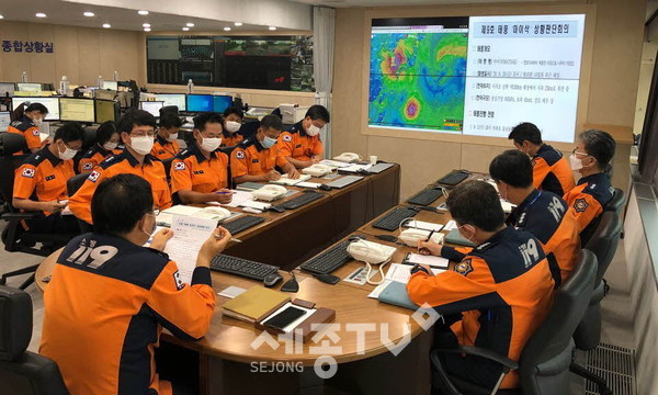 세종소방본부(본부장 강대훈)가 2일 16시부터 119종합상황실에서 상황판단회의를 열고, 제9호 태풍 ‘마이삭’ 북상에 따른 긴급대응태세를 점검했다.