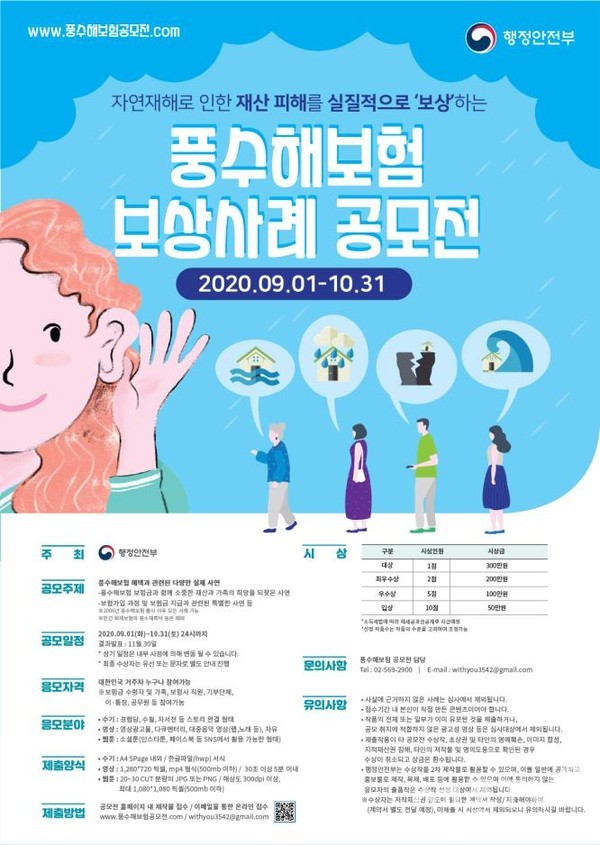 아울러 행정안전부에서는 풍수해보험 보상사례 공모전을 개최 중으로, 보다 자세한 내용은 풍수해보험공모전 홈페이지(www.풍수해보험공모전.com)에서 확인할 수 있다.