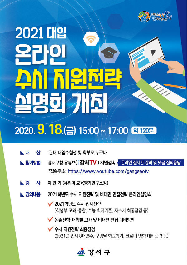 ‘대입 수시 지원전략 설명회’는 오는 18일 오후 3시부터 5시까지 2시간 동안 강서구청 유튜브 i강서TV(http://www.youtube.com/gangseotv)를 통해 실시간으로 진행한다.