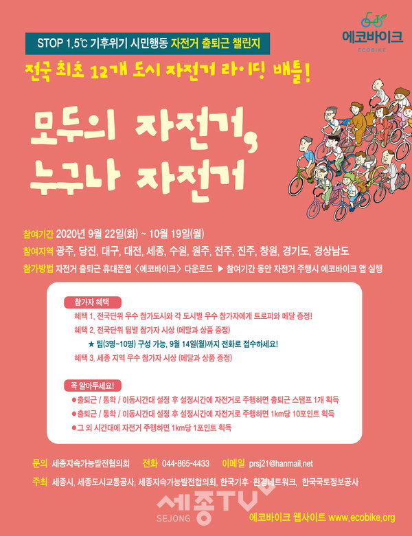 세종특별자치시(시장 이춘희)가 세종지속가능발전협의회, 한국기후·환경네트워크와 함께 기후위기에 대응하는 시민실천 활동의 하나로 ‘자전거 출퇴근 챌린지’ 행사를 오는 22일부터 10월 19일까지 개최한다.