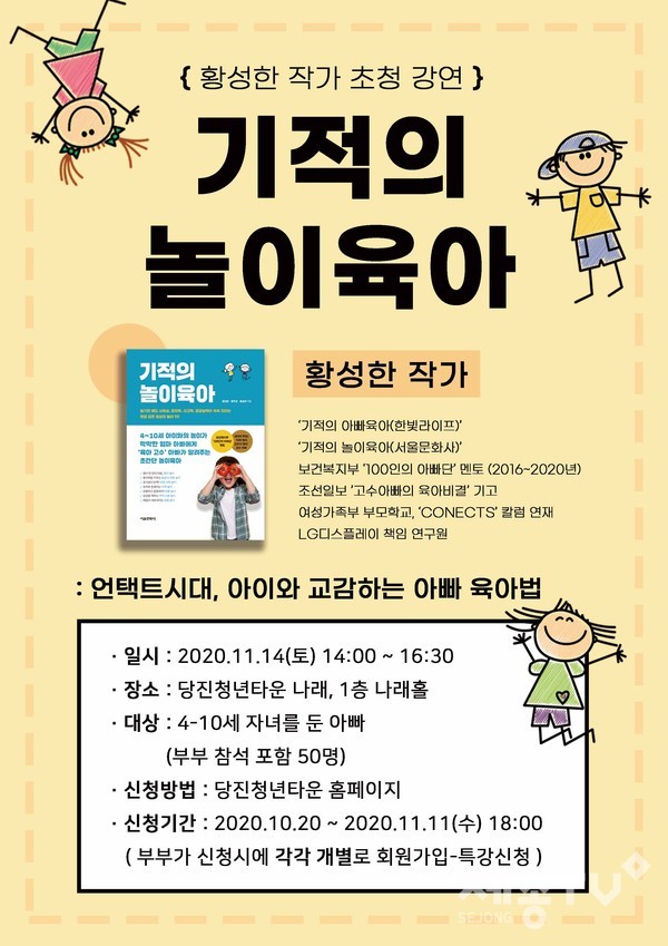 당진시가 청년멘토 특강으로 내달 14일 황성한 작가의‘코로나 시대 기적의 놀이육아’ 과정을 진행한다.