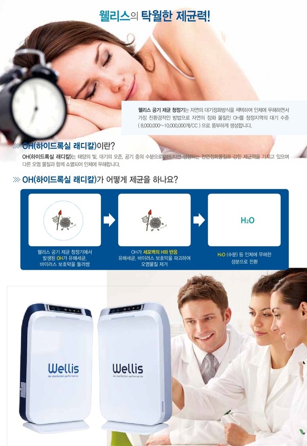 2013년 창업한 웰리스는 OH라디칼을 귤껍질 등에서 추출한 오렌지오일과 오존을 결합하는 자연정화 방식으로 생성하는 기술을 개발했다. 2016년 이 기술을 적용한 공기 제균 청정기(제품명 웰리스)를 본격 생산하고 있다. OH라디칼을 공기 중에 분산해 표면에까지 확산시켜 바이러스 등을 제거하는 방식이다.