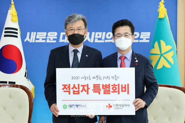 대전시는 허태정 대전시장이 4일(금) 오전 11시 시청에서 대한적십자사 대전세종지사 정상철 회장에게 2021년도 적십자 특별회비 500만원을 전달했다고 밝혔다.