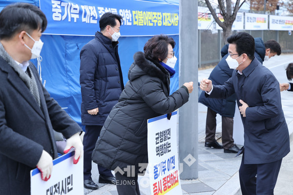 이 날 허태정 시장은 농성중인 시민단체분들을 격려하면서, “17일 정부부처 이전 공청회에 중기부 이전의 부당성과 지역피해 등을 강력히 전달하여 대전시민의 의지를 지켜내겠다.”고 말했다.