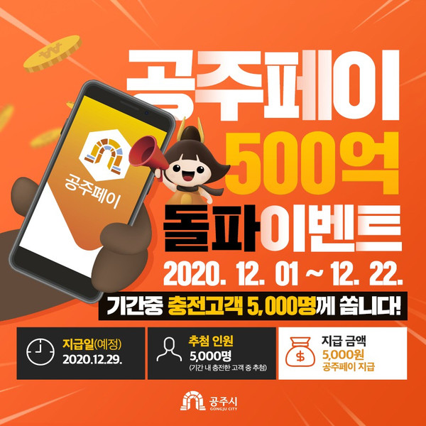 공주시(시장 김정섭)가 충남 최초 모바일 상품권 ‘공주페이’의 발행액 500억 돌파를 기념해 새해맞이 이벤트를 실시한다고 17일 밝혔다.