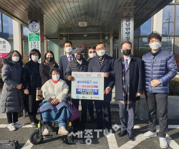 세종특별자치시 금남면에 위치한 세종우리협동조합(이사장 김승웅)이 30일 금남면 지역사회보장협의체(위원장 신상철·엄미숙·진승기)에 후원금 100만 원을 기탁했다.