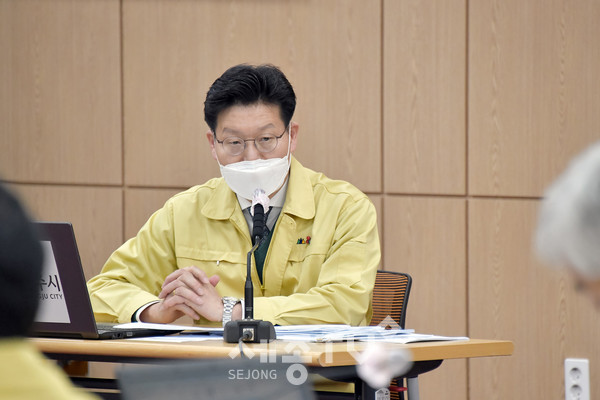 김 시장은 25일 시청 대백제실에서 열린 코로나19 대책회의 및 주간업무보고회 자리에서 “지난주 코로나19 지역 내 확진자가 연쇄적으로 발생했다. 지역 내 확산을 막기 위해 예정된 행사나 회의 등 시민들이 참여하는 모임은 일주일 연기하는 등 조정해 달라”고 말했다.