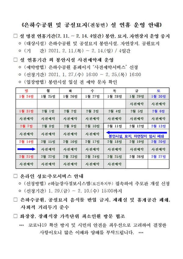 또한 설 연휴기간을 제외한 1월 29일부터 2월 25일까지는 봉안시설 사전예약제를 운영하여, 사전예약 대상 기간 동안 실내 봉안시설 방역 대책에 따라 1일 참배객 인원을 800명으로 제한한다. 사전예약 접수는 1월 27일 오후 4시부터 은하수공원 홈페이지를 통해 신청할 수 있다.
