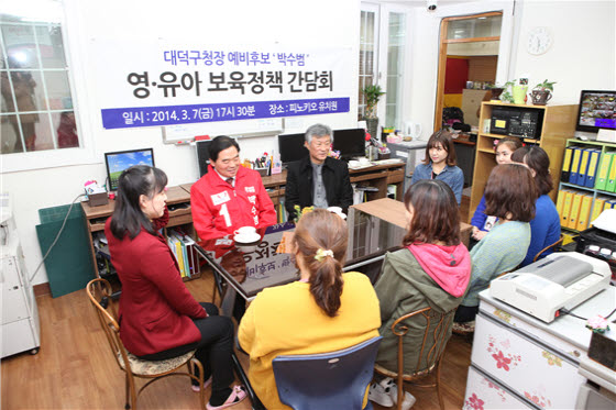 새누리당 대덕구청장 박수범 예비후보 7일 오후 5시 30분부터 6시 30분까지 대덕구 피노키오 유치원(원장 우서경)에서 교사들과 함께 영,유아 복지정책 간담회를 가졌다.
