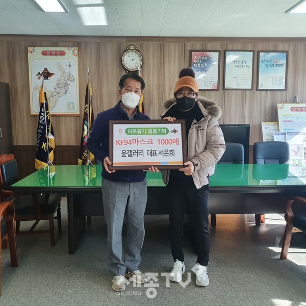 우성면에 위치한 가구전문점 공주 윤 갤러리의 서은희 대표는 이날 오동기 면장을 만나 코로나19 감염병 예방을 위해 지역 어르신들에게 전달해 달라며 KF94 마스크 1,000매(50만원 상당)를 전달했다.