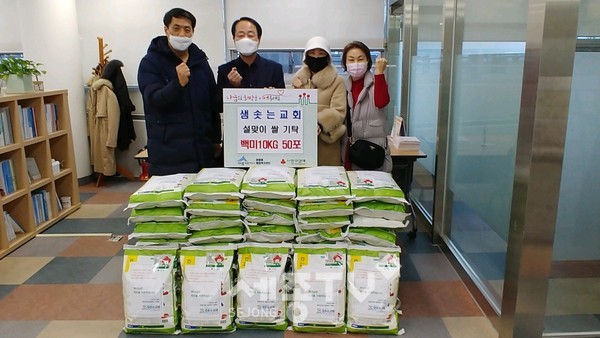 세종특별자치시 아름동(동장 여상수)에 위치한 샘솟는 교회(목사 최병남)가 지난 8일 어려운 이웃에게 전달해달라며 백미(1㎏) 50포를 기탁했다.