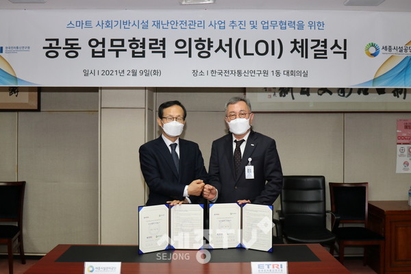 세종특별자치시시설관리공단(이사장 계용준)은 9일 한국전자통신연구원(ETRI, 원장 김명준)과 스마트 사회기반시설 안전관리 기술개발을 위한 협약을 체결했다고 밝혔다.