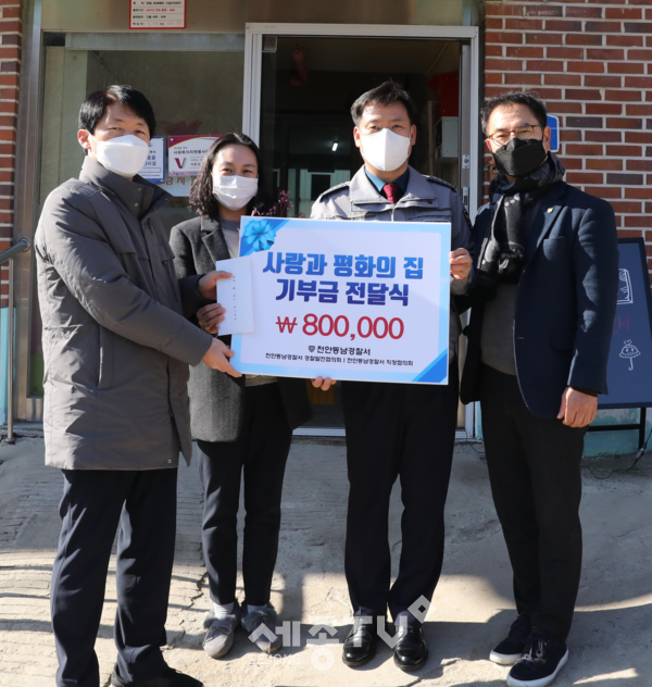 천안동남경찰서(서장 총경 백남익)는,9.(화) 11:00 경찰서장, 경찰발전협의회 위원, 경찰서 직장협의회장 등 10여명이 참석한 가운데 천안시 목천읍 소재 사회복지시설 ‘사랑과 평화의 집’에 방문, 민족 고유의 명절인 설을 맞아 생활에 불편과 외로움을 겪는 소외계층에 대하여 80만원 상당의 기부금을 전달하는 등 따뜻한 온정의 손길을 전하였다.