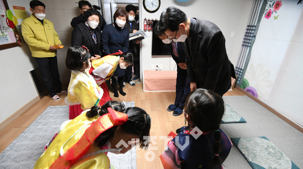 이어 논산애육원에 방문한 양승조 도지사와 황명선 논산시장은 시설 운영현황을 점검하고, 시설 관계자들의 애로사항을 청취하는 등 노고를 위로하며, 사과·귤 등의 위로품을 전했다.