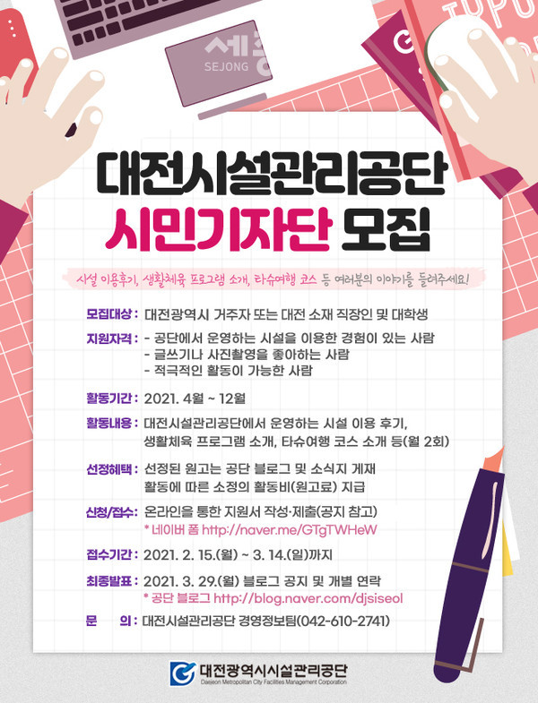 공단 시민기자단은 대전광역시 거주자 또는 대전 소재 직장인 및 대학생이라면 누구나 응모 가능하며, 모집기간은 2월 15일부터 3월 14일까지이다.