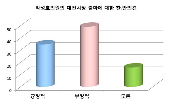 브레이크뉴스가 지난 2월 14일부터 15일까지 대전시민 1030명을 대상으로 박성효 국회의원의 대전시장 출마에 대한 의견을 묻는 여론조사를 실시한 결과 전체 49.3%(507명)가 출마에 부정적으로 답변했다. 출마에 긍정적으로 답변한 시민은 34.8%(358명)였으며, 15.9%(164명)는 '잘 모르겠다고'고 응답했다.