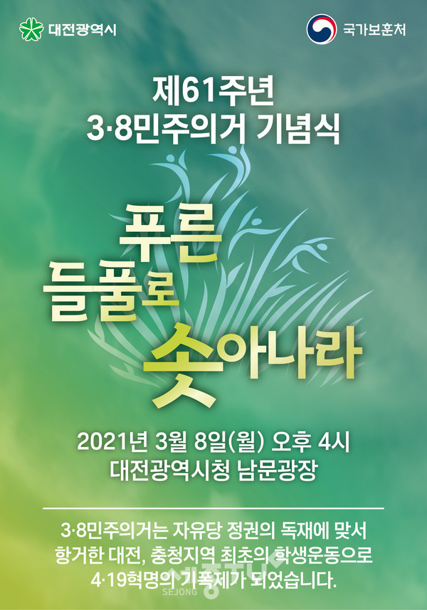 이 날 기념식은 국가보훈처 주관의 ‘푸른 들풀로 솟아나라’라는 주제로, 3·8민주의거 50주년을 기념해 지은 최원규 시인(충남대 명예교수)의 동명 시에서 모티브를 얻어 주제와 부합되게 선정했다.