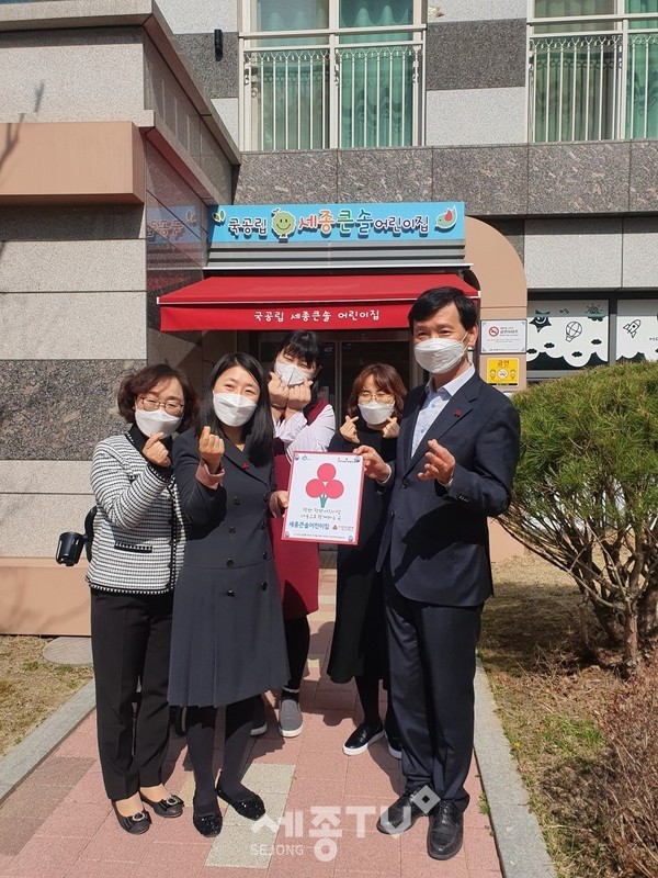 세종특별자치시 새롬동(동장 윤강욱)은 새뜸마을12단지 공동주택 내 ‘큰솔어린이집(원장 박수정)’이 매월 정기기부를 약속하고 ‘사랑의 열매 착한가게 등록 현판식’을 가졌다고 18일 밝혔다.