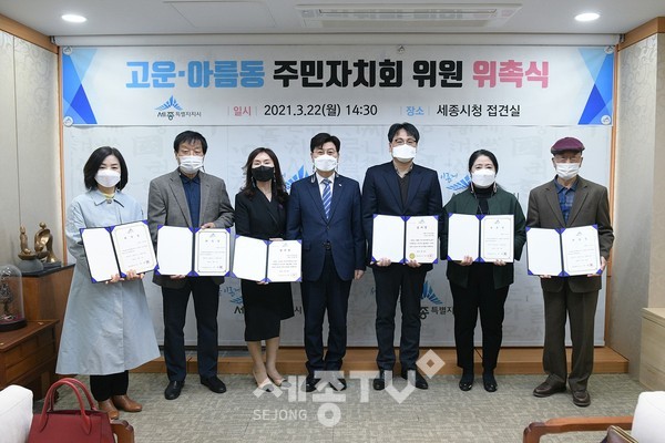 세종특별자치시(시장 이춘희)가 22일 시청 접견실에서 제1기 고운동과 아름동 주민자치회 위원 위촉식을 개최했다.