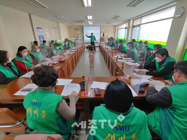 세종특별자치시새마을회(회장 윤대근) 협의회(회장 임한석) 부녀회(회장 엄미숙)가 23일 새마을회관 회의실에서 읍면동 회장과 총무 50여 명 대상으로 ‘2021 읍면동 실무자 교육’을 실시했다.