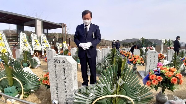역사를 잊는 사람들에게는 미래가 있을 수 없습니다. 낭만적 민족주의에 빠져 애써 이 젊은이들의 희생을 지우려 하는 정부의 태도를 비판하지 않을 수 없습니다. 이러한 태도야말로 이 땅의 평화와 우리의 미래를 위협하는 일입니다. 젊은 영혼들이 잠든 이 묘역에서 이 또한 다시 한번 확인합니다”라는 다짐을 밝혔다.