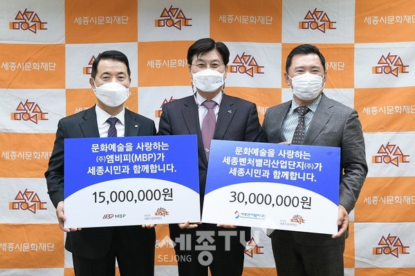 주식회사 엠비피(회장 이두식)가 5일 세종시청 접견실에서 세종시문화재단(대표이사 김종률)에 문화예술후원금 1천5백만 원을 전달했다.