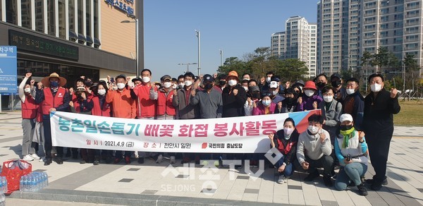 이날 봉사활동은 박찬주 도당위원장, 천안갑 신범철 · 천안을 이정만 · 천안병 이창수 당협위원장, 안상국 중앙위충남도연합회장, 이지원 도당여성위원장, 김철환 도당청년위원장 및 천안지역 당원 등 총 80여명이 참여해 구슬땀을 흘렸다.