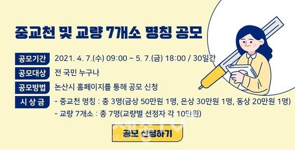 시 관계자는 “깨끗한 하천과 친수(親水)공간이 어우러진 논산시의 명소로 재도약하려는 중교천과 일곱 다리에 멋진 새 이름을 지어주려 공모전을 열게 되었다”며 “시민 여러분의 톡톡 튀는 아이디어가 담긴 다채로운 제안을 기다리고 있으니 적극적으로 참여해주시기 바란다”고 말했다.