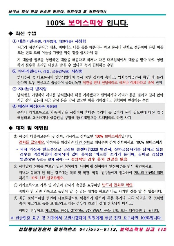 천안동남경찰서 원성파출소(소장 경감 이돈섭)는, 지난 4. 19.(月)부터 같은 달 22.(木)까지 18:00경부터 원성파출소 생활안전협의회와 함께 천안시 동남구 원성동 소재 교보사거리에서 전화금융사기 예방을 위한 캠페인 활동을 펼쳤다.