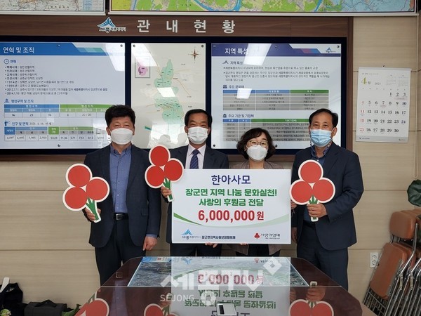 세종특별자치시 장군면 봉사단체 한아사모(회장 고성재)가 30일 회원과 후원자들이 십시일반 모은 성금 600만 원을 장군면에 기탁했다.