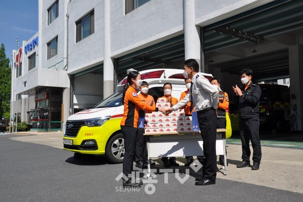 대전 대덕소방서장(남기건)은 12일 오전 119구급대를 방문하여 코로나19 대응을 위해 최일선에서 헌신하는 구급대원에게 격려물품을 전달하고, 구급대원의 애로사항을 청취 하는 등 소통의 시간을 가졌다.