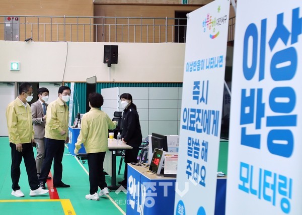 장종태 대전 서구청장은 20일 코로나19 예방접종센터인 도솔다목적체육관을 찾아 현장을 꼼꼼히 점검하고, 의료진과 자원봉사자 등 센터 운영 요원을 격려했다.