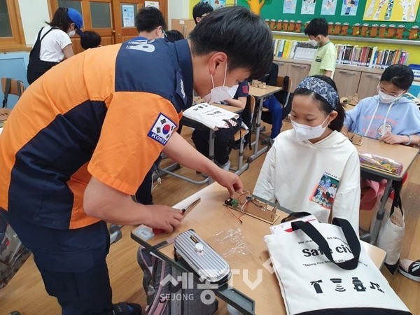 세종소방서(서장 안종석)가 지난 20일 금남면에 위치한 감성초등학교를 찾아 3·4학년 학생 40명을 대상으로 가정에서 발생할 수 있는 안전사고 대비를 위해 실습형 소방안전 체험교실을 운영했다.
