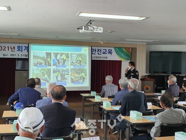 천안동남경찰서(서장 총경 백남익)는,’21.5.31.(월) 신부동에 위치한 천안시 노인회관에서 최근 농번기를 맞아 농기계와 노인 보행자 통행이 증가하여 교통사고를 예방하고자 천안시 노인분회장 30명을 대상으로 찾아가는 교통안전교육을 실시하였다.