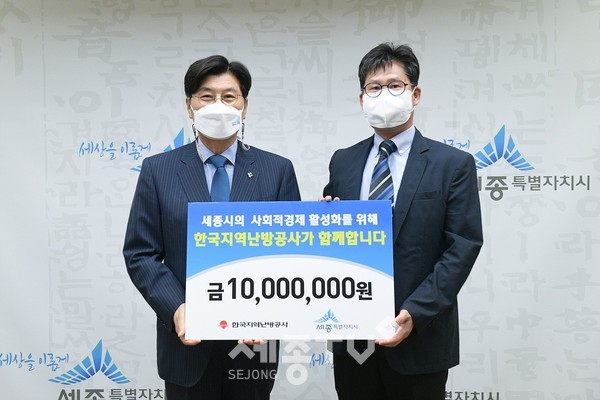 한국지역난방공사 세종지사(지사장 류시원)가 14일 시청 접견실에서 사회적경제 활성화를 위한 기부금 1,000만 원을 이춘희 세종특별자치시장에게 전달했다.