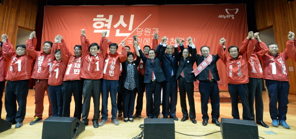 12일 세종시 세종시민체육관에서 새누리당 세종시장 단일후보로 선출된 유한식 전 세종시장과 당원들이 손을 들고 있다. 유한식 전 세종시장은 대의원 333명, 당원 500명, 국민선거인단 500명 총 1333명의 선거인단의 투표와 여론조사 20%로 진행된 경선에서 총 1021표 중 선거인단 676표, 여론조사 58.9%로 총 827표로 선출됐다. 저작권자 © SJB세종TV 무단전재 및 재배포 금지 세종TV 다른기사 보기 페이스북 트위터 카카오톡 네이버블로그 구글+ URL복사 기사공유하기