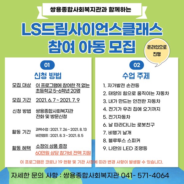 쌍용종합사회복지관(관장 권한대행 차윤희)은 LS그룹과 초록우산어린이재단이 지원하는 LS드림사이언스클래스에 선정되어 7월 26일부터 8월 13일까지 약 3주간 천안지역 초등학생 대상으로 프로그램을 진행한다고 밝혔다.