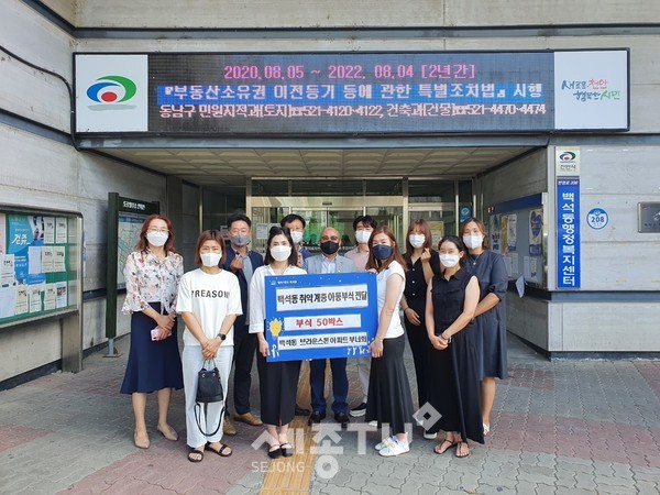 천안시 백석동 브라운스톤아파트 부녀회(회장 박혜진)가 26일 라면과 햇반, 햄 등이 담긴 총 50박스의 부식 상자를 취약계층 아동에 전달해 달라며 백석동에 기부했다.
