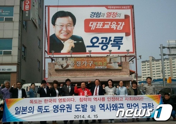 오광록 세종시교육감 예비후보는 15일 조치원읍 충현로에서 일본 극우세력의 독도 영유권 도발과 역사왜곡 망언을 규탄하는 집회를 가졌다.
