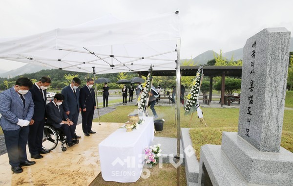 충남도의회 의장단(의장 김명선)은 27일 오전 국립대전현충원을 찾아 78년만에 고국의 품으로 돌아온 애국지사 홍범도 장군 묘역을 참배했다.