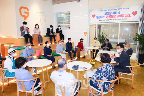 허태정 대전시장은 29일 동구 판암동에 위치한 동구행복한어르신복지관을 방문해 방역상황과 프로그램 운영현황 등을 점검하고 복지관 이용 어르신들과 대화의 시간을 가졌다.