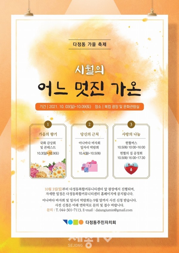 세종특별자치시 다정동 주민자치회(회장 고석은)가 오는 9일까지 마을계획사업인 ‘시월의 어느 멋진 가온’을 추진한다.