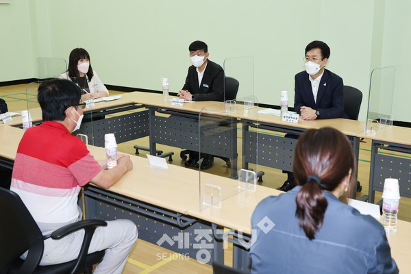 허태정 대전시장은 7일 대전광역시 시설관리공단에서 운영하는 장애인 복지 및 직업재활시설인“무지개복지공장”을 방문해 근로자들을 격려했다.